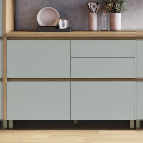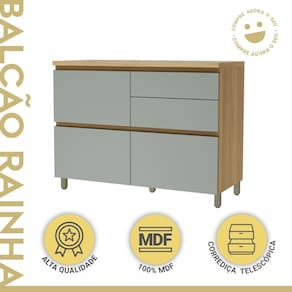Balcão 100% MDF com design contemporâneo e puxadores perfil gola. Portas articuladas com pistão a gás e pés reguláveis. Conta com gavetas com corrediças telescópicas, organizador robusto de talheres, porta-condimentos e gavetão com alta capacidade de carga. Estrutura resistente, com proteção contra umidade e montagem prática, garantindo durabilidade e excelente acabamento.