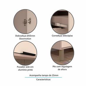 Características Estrutura: MDP 15mm Acabamento da Caixaria/Corpo: PF Acabamento das Portas/Frontal: BP Quantidade de Portas: 2 de Abrir Tipo de Dobradiças: Metálicas 35mm Slow Motion Quantidade de Gavetas: 3 Tipo de Corrediças: Metálicas Telescópicas Quantidade e Tipo de Puxadores: 5 Puxador em Alumínio Preto Quantidade de Prateleiras: 1 Tipo do Tampo: MDP 25mm com acabamento BP Com Rodatampo: Sim, em MDP 15mm, acabamento BP e 6cm de altura Sistema de Montagem: Cavilhas e parafusos. Garantia do Fabricante: 3 meses Itens inclusos: Balcão com tampo, manual de montagem, ferragens e acessórios.