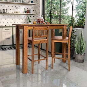 Conjunto rústico em madeira maciça, composto por balcão para bar e banquetas, ideal para criar um ambiente charmoso e aconchegante. Robusto e elegante, combina funcionalidade e estilo para espaços gourmet, áreas de lazer ou decoração sofisticada.