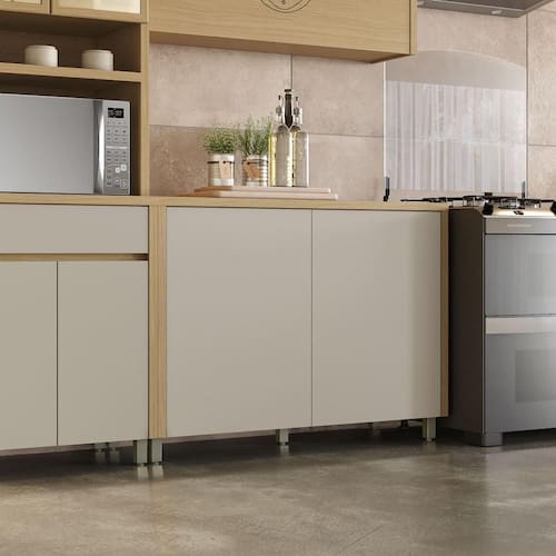 Praticidade e sofisticação para sua cozinha! Fabricado 100% em MDF, possui 2 portas amplas e prateleira interna, ideal para organizar utensílios, produtos ou roupas. Estrutura robusta, acabamento semi-brilho na cor Carvalho/Greige e pés reguláveis para maior estabilidade.