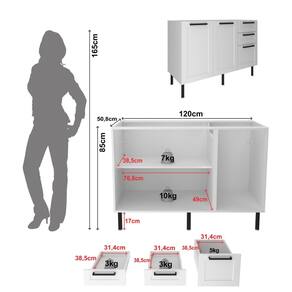 Características: Estrutura em MDF 2 Portas 3 Gavetas Corrediça telescópica Porta almofada Puxadores em alumínio preto Pés regulável de PVC Bordas em PVC Dobradiça reta Gaveta suporta até 3kg Prateleira suporta até 7kg Montagem reversível Não acompanha tampo