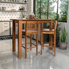 Conjunto rústico em madeira maciça, composto por balcão para bar e banquetas, ideal para criar um ambiente charmoso e aconchegante. Robusto e elegante, combina funcionalidade e estilo para espaços gourmet, áreas de lazer ou decoração sofisticada.