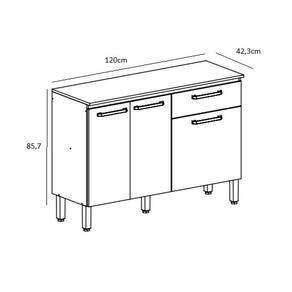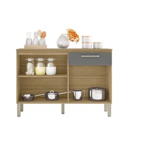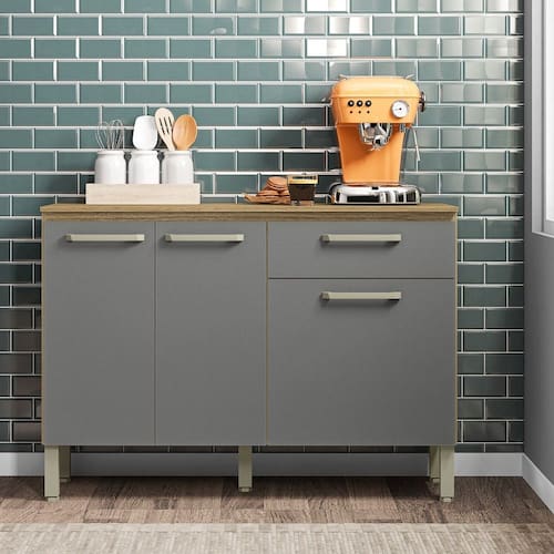 Com madeira reconstituída, que respeita o meio ambiente. Composto de três portas e uma gaveta, onde são utilizadas dobradiças e corrediças metálicas, tampo que traz a praticidade de utilização de decorações, utensílios para cozinha e até mesmo eletrodomésticos. Os puxadores são ergonômicos em plástico resistente -poliestireno-. Possui pés reguláveis em plástico resistente que garantem a estabilidade do produto. Acabamento com pintura UV.