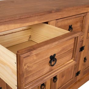 Produzido em madeira maciça de pinus com acabamento em cera fosca que ressalta os detalhes naturais da madeira.