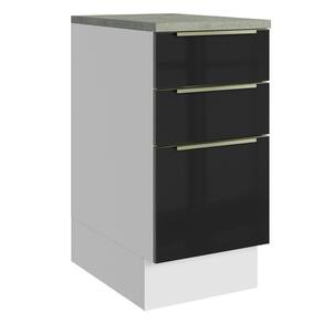 O balcão possui três gavetas grandes, sendo a última mais profunda, todas com puxadores em alumínio e corrediças telescópicas que possibilitam a abertura total.