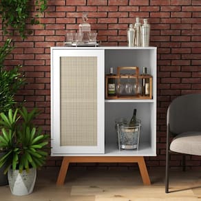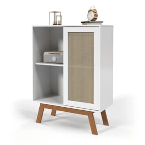 O Aparador Buffet Alto, com porta de correr e detalhes em rattan, é uma peça de destaque para qualquer ambiente. Ospés em madeira preta oferecem robustez e estabilidade, enquanto o design moderno e a funcionalidade do espaço interno garantem um visual elegante e ao mesmo tempo prático para sua sala ou hall de entrada.