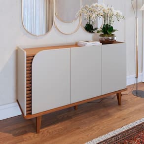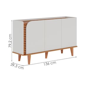 Balcão Buffet Jurerê é ideal para complementar ambientes com design moderno e detalhes retrô. Possui estrutura em MDP/ MDF (15 e 12 mm), fundo em HDF (3 mm) e acabamento em pintura UV texturizada. Tampo em estilo bandeja, lateral com detalhe ripado (alto relevo), 3 portas (sendo 1 delas de canto curvo), 2 prateleiras internas e pés em madeira maciça (estilo retrô) que valoriza sua sala de jantar. Este produto chegará em sua casa separado em 1 volume.