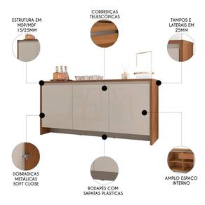 Com um amplo espaço interno, o Balcão permite organizar diversos objetos com facilidade, combinando praticidade e elegância. Sua estrutura robusta em MDP e MDF, com acabamento em pintura UV, traz durabilidade e sofisticação ao ambiente. O sistema de dobradiças metálicas com tecnologia soft close nas portas e corrediças telescópicas nas gavetas garantem suavidade no manuseio. Além disso, o Buffet possui 6 nichos, 3 prateleiras e uma gaveta interna, oferecendo excelente capacidade de armazenamento. As sapatas protetoras evitam danos ao piso, e os pés tipo rodapé, junto ao acabamento com bordas Soft PU, garantem um design harmonioso e moderno, tornando o Aparador um ponto de destaque na sua decoração.