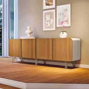 O Balcão Aparador Buffet Anabelle Off White/Cinamomo é uma peça versátil com funcionalidade, sendo perfeito para complementar a decoração da sala de jantar ou do hall de entrada. Seu design sofisticado não apenas valoriza o ambiente, mas também oferece praticidade, seja para organizar a mobília, expor itens decorativos ou até servir de apoio em momentos especiais. Produzido em MDF e MDP de 15mm, ele possui cantos arredondados e amplo espaço interno, 04 portas com dobradiças laterais e puxadores em alumínio com acabamento dourado, um sistema de amortecimento para portas, que garante um fechamento suave e silencioso. Os pés em aço maciço em tom dourado são um grande diferencial, garantindo resistência e estabilidade ao balcão, além de trazerem um toque de charme ao design. Gostou? Garanta a sua!