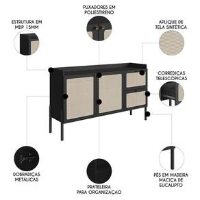 Esse Balcão Buffet é ideal para quem deseja adicionar um elemento de sofisticação à Sala de Estar. Construído com uma estrutura robusta em MDP de 15mm e um acabamento BP de alta qualidade, ele também possui 2 portas convencionais equipadas com dobradiças metálicas resistentes à corrosão. As gavetas, com corrediças telescópicas, proporcionam um espaço interno generoso e são equipadas com puxadores de poliestireno que facilitam o manuseio. Além disso, o Aparador se destaca pelos detalhes em tela sintética de PVC com poliéster, que são aplicados nas portas e gavetas, conferindo um toque retrô ao Aparador Bar. Os pés em madeira maciça de eucalipto, com sapatas emborrachadas nas extremidades, garantem estabilidade e evitam o atrito do móvel com o piso. Este balcão não é apenas funcional, mas também é uma peça de destaque que pode realçar a decoração de qualquer ambiente.
