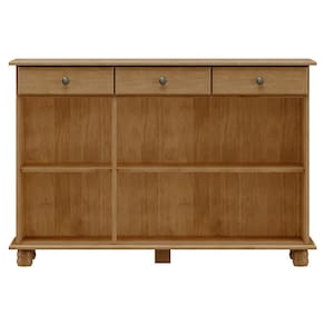 O Balcão Aparador Rubi da Finestra Móveis combina elegância e funcionalidade, sendo fabricado com estrutura em madeira maciça de pinus de reflorestamento e acabamento em pintura acetinada com verniz PU e UV. Conta com três portas equipadas com dobradiças com amortecimento e prateleiras internas em madeira maciça que suportam até 10kg distribuídos. Possui ainda três gavetas com corrediças telescópicas e capacidade para até 5kg cada, oferecendo amplo espaço para organização. Os puxadores metálicos em ouro envelhecido e os pés torneados em madeira maciça acrescentam um charme clássico ao design, tornando a peça ideal para salas de jantar, estar ou halls de entrada.