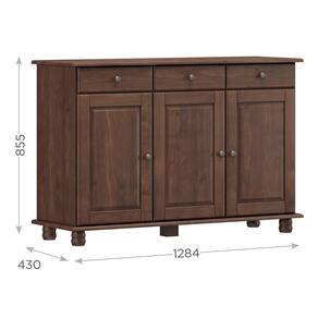 O Balcão Aparador Rubi da Finestra Móveis combina elegância e funcionalidade, sendo fabricado com estrutura em madeira maciça de pinus de reflorestamento e acabamento em pintura acetinada com verniz PU e UV. Conta com três portas equipadas com dobradiças com amortecimento e prateleiras internas em madeira maciça que suportam até 10kg distribuídos. Possui ainda três gavetas com corrediças telescópicas e capacidade para até 5kg cada, oferecendo amplo espaço para organização. Os puxadores metálicos em ouro envelhecido e os pés torneados em madeira maciça acrescentam um charme clássico ao design, tornando a peça ideal para salas de jantar, estar ou halls de entrada.