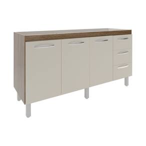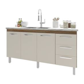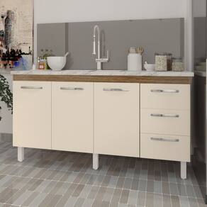 Características: Altura com pés: 83,5 cm Altura sem pés: 67 cm Largura: 148 cm (padrão para pia de 150 cm) Profundidade: 50 cm Material: MDP (madeira) Portas: 3 portas Gavetas: 3 gavetas Prateleiras: 1 prateleira Puxadores: 6 puxadores plásticos cromados Pés: 6 pés reguláveis de plástico Altura dos pés: 16,5 cm Regulagem dos pés: Somente para nivelamento (chega no máximo a 18 cm) Corrediças: Metálicas Indicações de uso: Cozinha