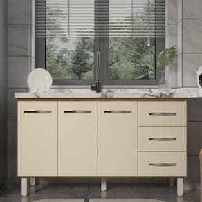 Altura com pés: 83,5 cm Altura sem pés: 67 cm Largura: 138 cm (Compatível com pias de 140 cm) Profundidade: 50 cm Material: MDP (Madeira de Média Densidade) Portas: 3 portas Gavetas: 3 gavetas Prateleiras: 1 prateleira interna Puxadores: 6 puxadores plásticos cromados Pés: 6 pés de plástico reguláveis Altura dos pés: 16,5 cm Regulagem dos pés: Ajuste máximo até 18 cm, apenas para nivelamento Corrediças: Metálicas Uso recomendado: Cozinha Nota: A imagem é ilustrativa. O produto não inclui tampo, pia ou objetos decorativos. Apenas o balcão está à venda.