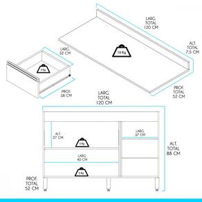 Dimensões do Balcão: Altura: 88 cm Largura: 120 cm Profundidade: 52 cm Peso: 30 kg