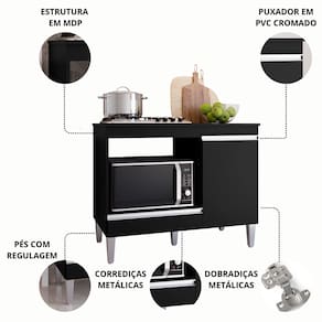 - MDP; - Pintura em UV; - 1 Porta com Dobradiças Metálicas; - Puxadores em PVC; - Indicado para Fogão Cooktop de 4 ou 5 bocas; - Tampo marcado para recorte e deverá ser recortado para usar Cooktop; - Nicho para Forno ou Microondas;