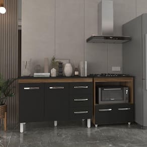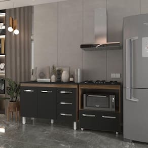 Balcão Armário Gabinete Bruna 118 Cm Savana Preto Com Tampo Preto E Balcão Evelyn Para Cooktop 5 Bocas Savana Preto Transforme sua cozinha com este kit prático e elegante! Composto pelo balcão Bruna de 120 cm com tampo, ideal para armazenamento e apoio no preparo de refeições, e pelo balcão Evelyn para cooktop de 5 bocas, que proporciona uma instalação segura e organizada. Seu design moderno, materiais resistentes e acabamento sofisticado garantem funcionalidade e beleza para um ambiente mais aconchegante e eficiente. Características do Balcão de Pia Bruna 118 cm: