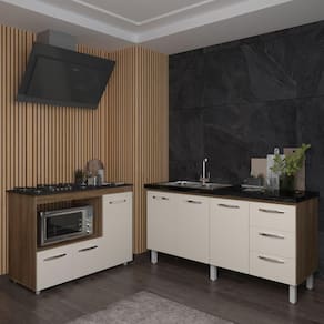 Características do Kit Montado: Largura total: 262 cm Profundidade: 50 cm Altura: 85,5 cm (com tampo do balcão de cooktop)