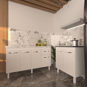 Características do Balcão de Pia Camila 138 cm: Altura com pés: 83,5 cm Altura sem pés: 67 cm Largura: 138 cm (Padrão para pia de 140 cm) Profundidade: 50 cm Material: MDP (Madeira de Média Densidade) Portas: 4 portas Gavetas: 1 gaveta Prateleiras: 1 prateleira Puxadores: 6 puxadores plásticos cromados Pés: 6 pés reguláveis de plástico Altura dos pés: 16,5 cm Regulagem dos pés: Somente para nivelamento (chega no máximo a 18 cm) Corrediças: Metálicas Indicação de uso: Cozinha Acompanha tampo: Não