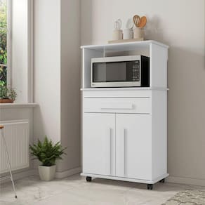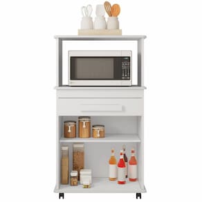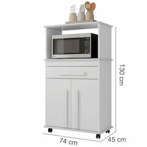 Estrutura: : : : : : MDPAcabamento: : : : : : Pintura U.V, com acabamento foscoPorta: : : : : : Sim, 02 portas de abir/fechar, com dobradiças metálicasGavetas: : : : : : Sim, 01 gaveta com corrediças telescópicaPrateleira: : : : : : Sim, 01 prateleira internaPuxador: : : : : : Sim, em MDFNicho: : : : : : Sim, para a forno ou micro-ondasPés: : : : : : Sim, 04 rodízios para melhor mobilidade do móvel no dia a dia: : : : : :