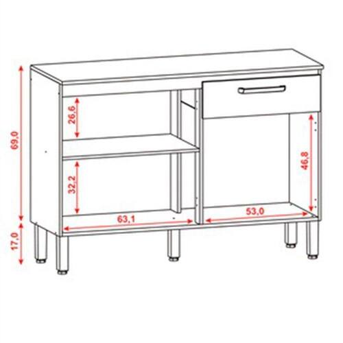 Com madeira reconstituída, que respeita o meio ambiente. Composto de três portas e uma gaveta, onde são utilizadas dobradiças e corrediças 100 metálicas, tampo que traz a praticidade de utilização de decorações, utensílios para cozinha e até mesmo eletrodomésticos.