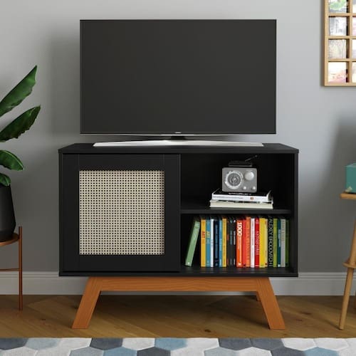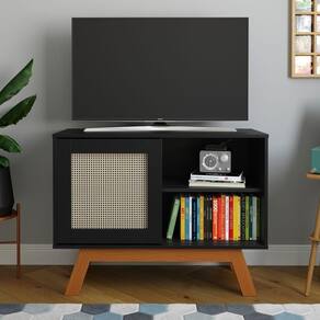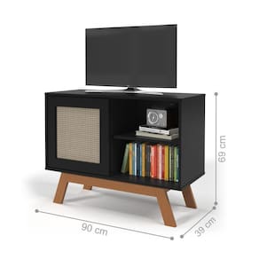 O produto dispõe de 1 porta de correr feita em rattan sintético, para guardar o que desejar, e 1 prateleira para que você utilize da forma que preferir.