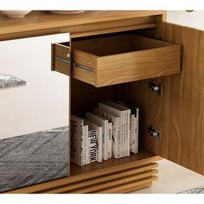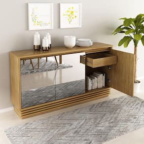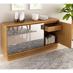 Balcão Buffet BB2609. Cheio de elegância e requinte, este balcão irá ser destaque em sua sala de jantar. Possui estrutura em MDP de 15mm, já o tampo, as laterais, a base e as portas são de 25mm de espessura, pintura com acabamento em Uv (Fosco). Conta com 03 portas articuladas com espelhos proporcionando um visual sofisticado, possui 03 dobradiças metálicas em cada porta garantindo maior resistencia e durabilidade, 01 gaveta interna com corrediças metálicas e laterias de 25mm de espessura, 01 prateleira interna que suporta até 10 kg, com design super atual a base conta com aplique decorativo super elegante, e um amplo espaço interno, que acomoda louças, copos e utensílios para auxiliar naqueles momentos de confraternização, o tampo também é um grande aliado, pois apoia desde itens decorativos até bandejas com as melhores receitas para aquelas refeições em família. Este móvel chegará na sua casa separado em 02 volumes.