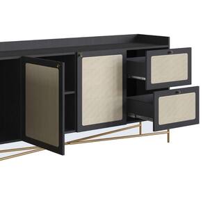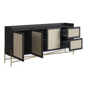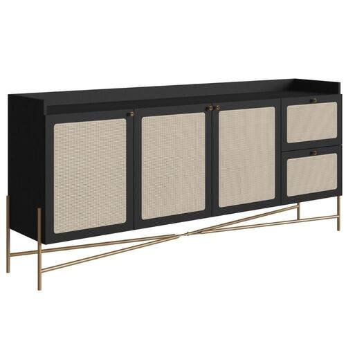 Balcão Buffet 3 Portas Oslo Artesano 183 Cm (largura) Mdp Nero Palha Sintética Bege Pé Metal Dourado