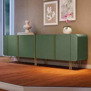 O Balcão Buffet Saluti possui cantos arredondados o que traz sofisticação a sua sala de Jantar. O espaço interno é amplo. Portas com dobradiças laterais e puxadores em alumínio com acabamento na tonalidade dourado; Sistema de amortecimento para portas, proporcionando um fechamento suave e silencioso; Pés em aço maciço 3/8 com acabamento em tom dourado; Produzido em MDF e MDP de 15mm;
