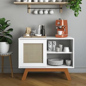 A Balcao Buffet Aparador Bar Porta de Correr Bali pés em Madeira oferece sofisticação e funcionalidade. O design com rattan e os pés de madeira tornam este aparador um item essencial para quem deseja um ambiente elegante.