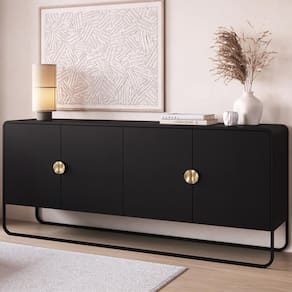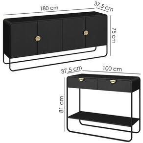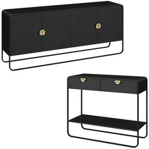 Conjunto de Buffet e Aparador com design orgânico e contemporâneo, ideal para compor salas de jantar com funcionalidade e estilo. Estrutura em MDP 15 mm, cantoneiras em MDF e acabamento em pintura BP. Possui 4 portas com dobradiças metálicas, 2 gavetas com corrediças telescópicas, prateleiras internas e externas, puxadores em poliestireno, pés em metal e sapatas plásticas que protegem o piso contra riscos. Produto entregue em 02 volumes.