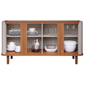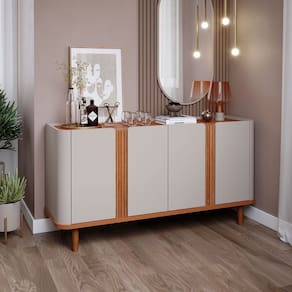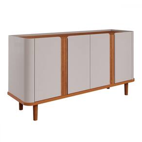 O(a) Balcão Buffet Eva 4 Portas 2 Prateleiras Off White/Cinamomo - Cimol é produzido em MDF na escala de brilho Semi-Brilho, e possui um grau de dificuldade de montagem: Médio.