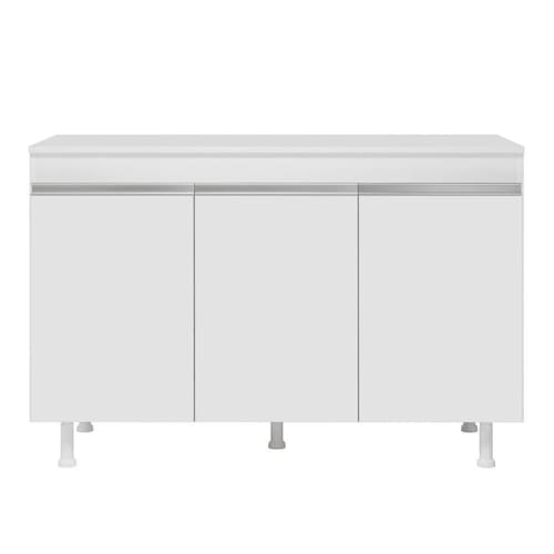 Construído com 100% de MDF, este balcão oferece durabilidade e resistência superiores. Suas três portas, equipadas com dobradiças metálicas de alta qualidade, garantem um acesso fácil e conveniente ao seu conteúdo, enquanto os puxadores em alumínio adicionam um toque moderno e refinado.