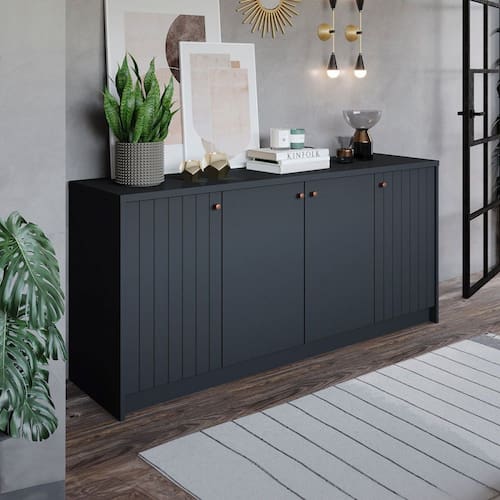 O(a) Balcão Buffet Lia 4 Portas 3 Prateleiras Cinza - Cimol é produzido em MDF na escala de brilho Semi-Brilho, e possui um grau de dificuldade de montagem: Médio.