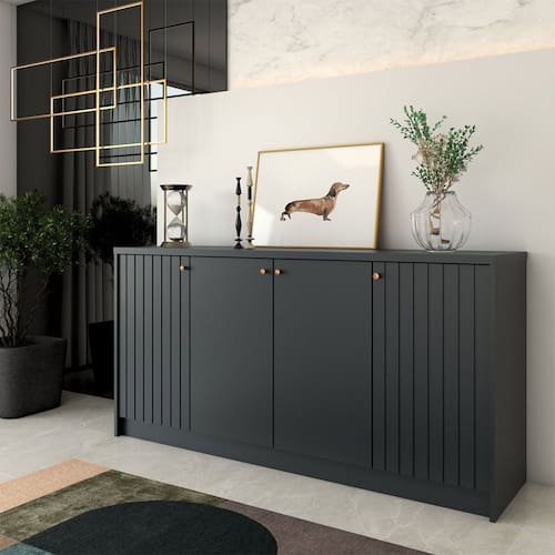 O(a) Balcão Buffet Lusso 4 Portas 3 Prateleiras Cinza - Loja é produzido em MDF na escala de brilho Semi-Brilho, e possui um grau de dificuldade de montagem: Médio.