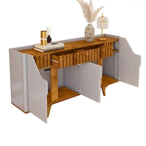 O(a) Balcão Buffet Madison 4 Portas 2 Gavetas Ripado Off White/Naturallle - Pnr Móveis é produzido em MDF na escala de brilho Brilhante e Fosco, e possui um grau de dificuldade de montagem: Médio.