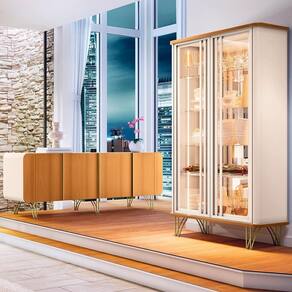 O Buffet possui quatro portas com amplo espaço interno para guardar louças, talheres e outros objetos. As portas têm dobradiças laterais com sistema de amortecimento, que evita batidas e ruídos. Os puxadores são de alumínio com acabamento dourado, que combinam com o design arredondado do móvel. A Cristaleira de Vidro é ideal para expor suas taças, copos e com estilo e sofisticação. Ela possui portas de vidro emolduradas e arredondadas, que se abrem com um simples toque. A iluminação LED nas laterais cria um efeito luminoso e destacam os objetos no interior. A Cristaleira conta com três prateleiras de vidro de 6mm, uma adega com divisórias para seis garrafas e espelhos ao fundo, que ampliam o espaço e refletem a luz. Os pés são de aço com tom dourado, harmonizando com o Balcão Buffet.