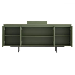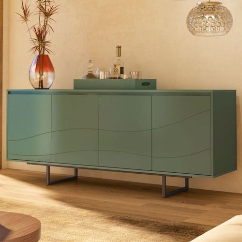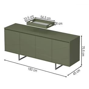 O(a) Balcão Buffet Serra do Mar 4 Portas 3 Prateleiras com Bandeja Menta - Artely Móveis é produzido em MDF e MDP na escala de brilho Fosca com Textura, e possui um grau de dificuldade de montagem: Médio.
