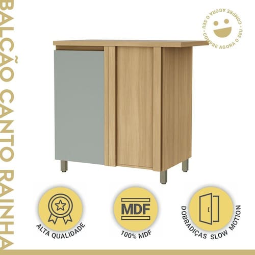 Com um grande diferencial, o balcão Rainha possui maior altura útil do mercado, proporcionando maior espaço para guarda de utensilios e mantimentos e ainda com pés menores 10cm. O pé de 10 cm, deixa o conjunto com maior robustez, proporcionalidade e beleza. Projetado para proporcionar praticidade e funcionalidade no uso diário, produzida com matérias prima de alto nível e ferragens tecnológicas de última geração. Suporta Granito: Não Acabamento da Prateleira: Pintura Escala de Brilho da Prateleira: Fosco Acabamento da Porta: Impressão Escala de Brilho da Porta: Fosco Produto Montado: Sim Acabamento: Impressão Acabamento dos Pés: Pintura Acompanha Tampo: Sim Altura dos Pés: 10 cm Ambiente Principal: Cozinha Balcão Acompanha Pia: Não Cesto para Frutas: Não codigo_ean: 7909903399460 Complexidade da Montagem: Média: pode ser montado por mais de uma pessoa e/ou necessite de maior conhecimento para montagem Cor: Marrom/Verde Cor do Produto: Marrom/Verde Escala de Brilho: Fosco Itens Inclusos: 1 Balcão, 1 Manual de Montagem e 1 Kit Ferragens. Manual de Montagem e Instalação: https://product-hub-prd.madeiramadeira.com.br/865715/documents/b721361a-5aa2-486f-87d4-20a1edf01073alcaocantodiresq1pt920x520.pdf Material da Dobradiça/Corrediça da Porta: Aço Material da Porta: MDF Material da Prateleira: MDF Material do Tampo: MDF Material dos Pés: Polipropileno Medida do Tampo (L x C x E): 92cm x 52cm x 1,5cm Necessita Montagem: Sim O Balcão Acompanha Pia: Não Origem do Produto: Nacional Pés Reguláveis: Sim Peso: 37 kg Peso Máximo por Prateleira: 15 kg Possui Pés: 04 Possui Portas: Sim Possui recorte para Cooktop: Não Recomendações de Uso, Manutenção e Limpeza: Utilizar pano macio levemente umedecido e na sequencia pano macio seco. Sapatas Niveladoras: Sim Sistema de Montagem: Parafusos e Cavilhas Suporta Até (kg): 30 kg Tipo de Dobradiça/Corrediça da Porta: 35 mm Tipo de Porta: Bater Tipo de Puxador da Porta: Embutido Ean: 7909903399460