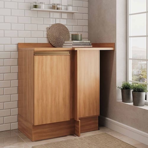 Inspirada na força e beleza da árvore Aroeira, este balcão de cozinha foi criado para ser o coração da casa, combinando design moderno, praticidade e resistência. Produzido em MDP com acabamento finish foil, oferece qualidade em cada detalhe: dobradiças com amortecimento e corrediças telescópicas reforçadas. Modular e versátil, adapta-se ao seu espaço com pés reguláveis, rodapé removível e opção de balcões suspensos. O Balcão Aroeira é mais que um móvel, é o cenário para histórias e momentos que duram. Suporta Granito: Sim Acabamento da Prateleira: Finish Foil Escala de Brilho da Prateleira: Semi-Brilho Acabamento da Porta: Finish Foil Escala de Brilho da Porta: Semi-Brilho Material do Puxador da Porta: Alumínio Produto Montado: Sim Acabamento: Finish Foil Acabamento dos Pés: Polipropileno Acompanha Rodapé Decorativo: Sim Acompanha Tampo: Sim Altura dos Pés: 15 cm Altura Máxima dos Pés: 15.0000 Ambiente Principal: Cozinha Balcão Acompanha Pia: Não Balcão Suporta Pia: Não Cesto para Frutas: Não codigo_ean: 7900288212979 Complexidade da Montagem: Média: pode ser montado por mais de uma pessoa e/ou necessite de maior conhecimento para montagem Cor: Cedro Cor do Produto: Cedro Cor Flex: Não Cor Interna: Cedro Escala de Brilho: Semi-Brilho Espessura do Material da Estrutura: 15 mm Itens Inclusos: 1 Balcão, Manual de Montagem e Kit Ferragens. Linha ou Coleção: Aroeira Manual de Montagem e Instalação: https://product-hub-prd.madeiramadeira.com.br/367749780/documents/18bbbe56-22a3-4f1d-a358-c78e49f3227d99a8a9c43f9ae6dc1755107638.pdf Marca: CabeCasa MadeiraMadeira Material da Dobradiça/Corrediça da Porta: Metálica Material da Porta: MDP Material da Prateleira: MDP Material do Tampo: MDP Material dos Pés: Polipropileno Medida do Tampo (L x C x E): 56 cm x 52 cm x 2,5 cm | 43 cm x 52 cm x 2,5 cm modular: Sim Montagem Flex: Sim, a porta pode ser montada para ambos os lados do canto Necessita Montagem: Sim O Balcão Acompanha Pia: Não Origem do Produto: Nacional Pés Reguláveis: Sim Peso: 31,2 kg Peso Máximo por Prateleira: 13 kg Possui Pés: 04 Possui Portas: Sim Possui recorte para Cooktop: Não Recomendações de Uso, Manutenção e Limpeza: A limpeza deve ser feita com pano macio, levemente umedecido com água e sabão neutro. Em seguida, passe um pano seco para evitar o acúmulo de umidade. Nunca utilize produtos abrasivos, esponjas de aço, alvejantes, álcool em excesso ou solventes, pois esses produtos podem agredir o acabamento e comprometer sua aparência. Sapatas Niveladoras: Sim Sistema de Montagem: Minifix, Parafusos e Cavilhas. Suporta Até (kg): 47 kg Tipo de Base (pés): Pés Tipo de Dobradiça/Corrediça da Porta: Soft close Tipo de Porta: Bater Tipo de Puxador da Porta: Externo Marca: Não Informado
