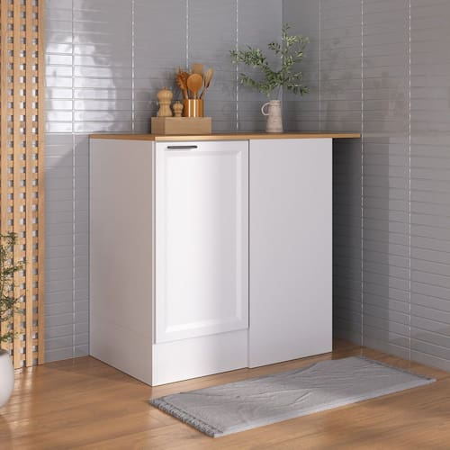 Informações Complementares: Balcão canto reto com tampo de 27mm de espessura, porta de bater almofadada/moldurada em MDF 4mm, dobradiças de 35mm, prateleira interna, puxador retrô em aluminio, pés reguláveis, rodapés removíveis com presilhas modelo click.