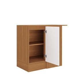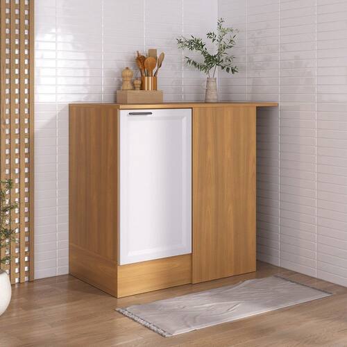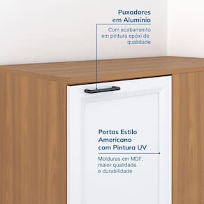 Informações Complementares: Balcão canto reto com tampo de 27mm de espessura, porta de bater almofadada/moldurada em MDF 4mm, dobradiças de 35mm, prateleira interna, puxador retrô em aluminio, pés reguláveis, rodapés removíveis com presilhas modelo click.