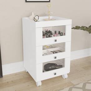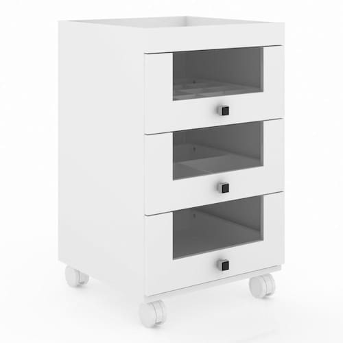 Características do Produto Material da Estrutura: MDP 15 mm. Peso Suportado: Topo e Gavetas: 3 kg. Cor: Branco. Acabamento: BP. Escala de Brilho: Fosco. Quantidade de Gavetas: 3 Gavetas. Material da Gaveta: MDP/Vidro. Tipo de Corrediças: Telescópica. Tipo de Puxador: PVC cromado. Possui Rodízios: Sim. Diferenciais: - Design moderno. - Estrutura reforçada. - Gavetas com divisores. Sistema de Montagem: Minifix / Cavilhas / Parafusos. Manual de Montagem: Sim. Complexidade da Montagem: Média. Volumes: 1 Volume. Garantia do Fabricante: 90 dias contra defeito de fabricação. Montagem: Recomendamos que seja feita por um profissional. Recomendação de Limpeza: Utilize pano levemente úmido.