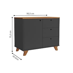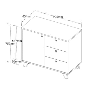Ela possui um design marcante, com Tampo, Laterais e Base em MDP 18mm. Possui uma porta com prateleira interna com regularem, três gavetas com deslizamento suave.