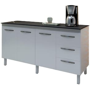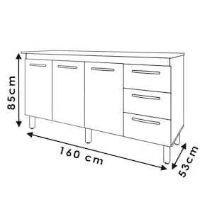 Balcão Emily com Tampo, uma excelente opção para sua casa. Estrutura em MDP de 12/15mm, com acabamento em pintura UV. Composto por 03 portas com dobradiças metálicas, uma prateleira interna para maior aproveitamento do espaço, 03 gavetas com corrediças metálicas, ideal para armazenar seus utensílios de cozinha, puxadores em plástico cromado, acompanha tampo de 160 cm, pés fixos de 16,5cm que garantem a firmeza que o móvel precisa, possui perfeita combinação com os mais variados ambientes, seja sozinho ou com outros móveis que você também encontra em nosso site. Você pode compor sua cozinha da forma que desejar. Este móvel chegará em sua casa separado em 02 volumes.