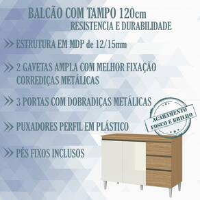 Balcão De Cozinha Com Tampo, ideal para quem busca modernidade e praticidade. Estrutura em MDP de 12mm e 15mm proporcionando resistência e durabilidade. Contando com acabamento em verniz, este acabamento garante manter a beleza constante do móvel, resistência e durabilidade, prolongando a vida útil do produto. Composto por 03 portas articuladas com dobradiças metálicas dando maior durabilidade ao abrir e fechar, 02 gavetas amplas com corrediças em metal para melhor deslize, e puxadores perfil com design moderno e resistente em plástico PVC que garante mais segurança no fechamento das portas, acompanha tampo 120 cm e 05 pés em PVC. Amplo espaço interno para organizar os utensílios domésticos com total praticidade e funcionalidade do dia a dia, ideal para compor sua cozinha da forma que desejar. Este móvel chegará em sua casa separado em 01 volume.