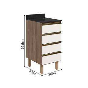 Balcão com tampo funcional e compacto para composições modernas. Com 40cm de largura, fabricado 100% em MDF, possui estrutura e tampo de 15mm, com forro de 3mm. Conta com 4 gavetas com corrediças telescópicas e puxadores em perfil alumínio. Os 4 pés possuem altura de 15,5cm com regulagem adicional de 1,5cm, garantindo estabilidade em qualquer piso. Este móvel chegará em sua casa separado em 3 volumes.
