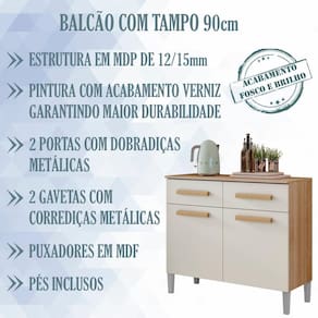 Balcão Para Cozinha Com Tampo Juma/Lilian, é a escolha certa para você que quer uma cozinha moderna, compacta e organizada. Estrutura em MDP de 12 e 15mm, pintura com acabamento em Verniz, este acabamento garante manter a beleza constante do móvel, resistência e durabilidade, prolongando a vida útil do produto. Composto por 02 portas com dobradiças metálicas, 02 gavetas com corrediças metálicas com ótima fixação e deslize livre de enrosco, puxadores em MDF, amplo espaço interno proporcionando mais conforto e comodidade na hora de organizar sua cozinha. Este móvel chegará em sua casa separado em 01 volume.