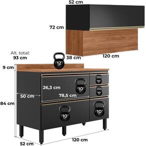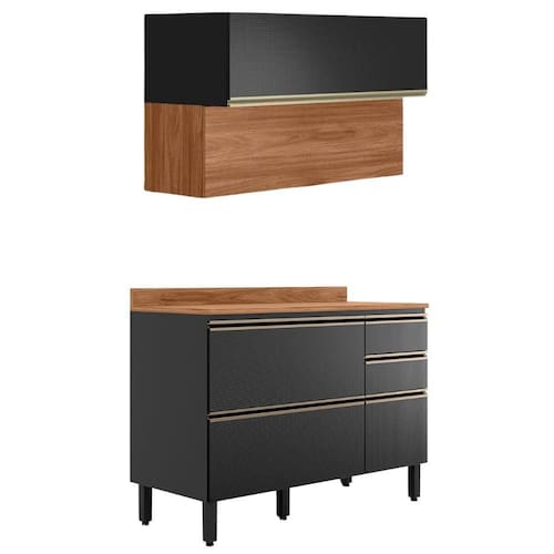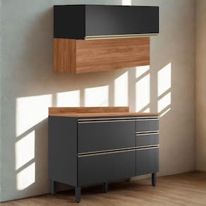 Sofisticado e funcional, o Conjunto Balcão e Armário Proença foi pensado para otimizar o espaço com elegância. Produzidos 100% em MDF (20 e 15 mm) com acabamento em pintura UV. Conta com portas basculantes com pistão a gás e dobradiças metálicas de 35 mm, gavetas laterais (uma com divisor de talheres) e gavetão inferior, equipadas com corrediças telescópicas, pés com regulagem de altura, puxadores em alumínio e tampo em MDF 20mm. Este produto será entregue em 04 volumes.