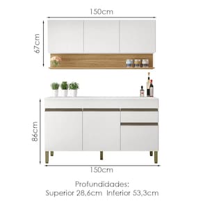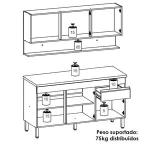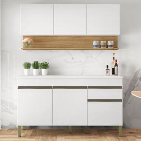 Balcão Com Tampo e Armário Aéreo para quem busca praticidade na organização da cozinha. Produzido em MDP (15mm) com acabamento em pintura UV texturizada. Conta com 06 portas (portas superiores com sistema passante), 01 gaveta, 01 nicho decorativo, dobradiças e corrediças metálicas e 01 prateleira interna. Os pés reguláveis são em plástico resistente e os puxadores em perfil alumínio (pintura epóxi). Este produto será entregue em 04 volumes.